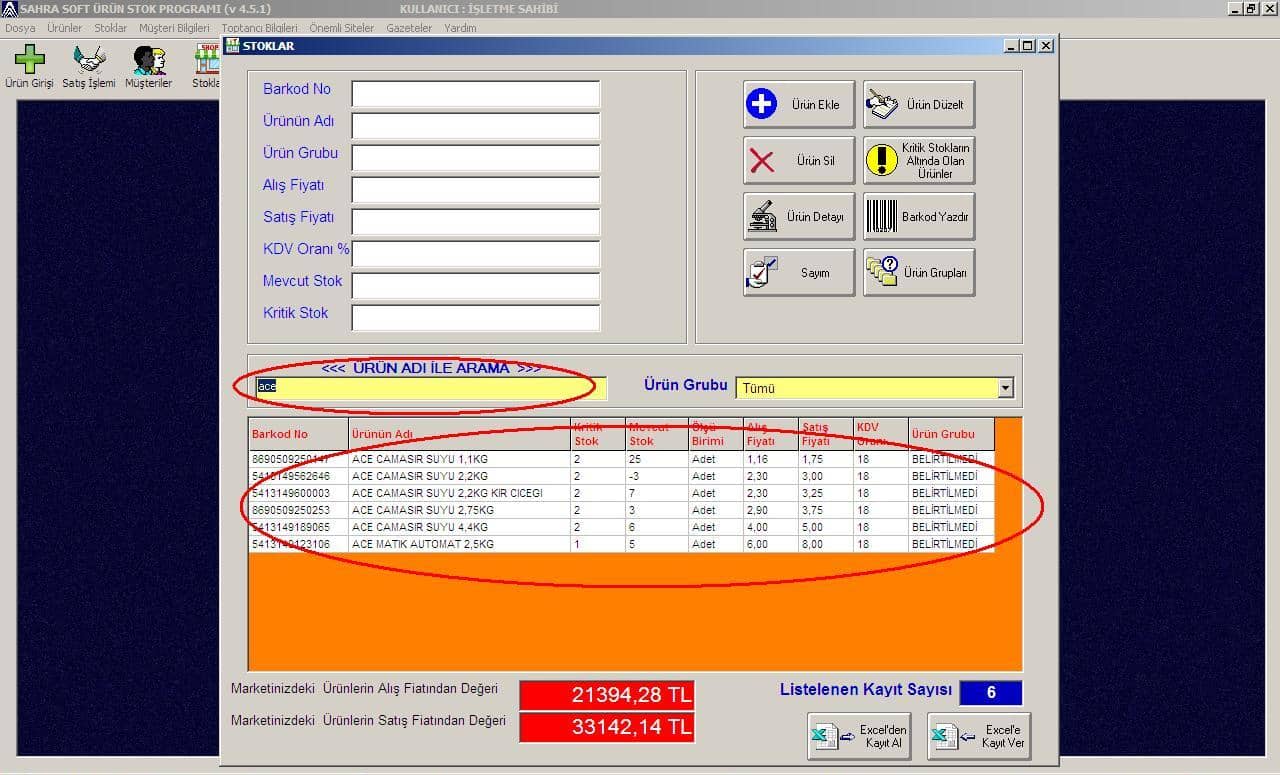 -Aradığınız ürünü ekrana getirmek için Ürün Adıyla Arma kutusuna arayacağınız ürünün birkaç harfini yazarak veya barkod numarasını yazarak veya ürünün barkodunu okutarak aradığınız ürünü stok listesinde görebilirsiniz.